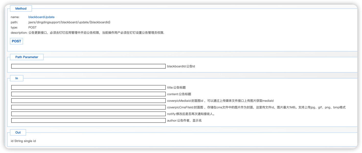 url: /x_app_dingding_support_assemble_control/ jaxrs/dingdingsupport/blackboard/update/{blackboardid} method: post 具体参数说明如下图: