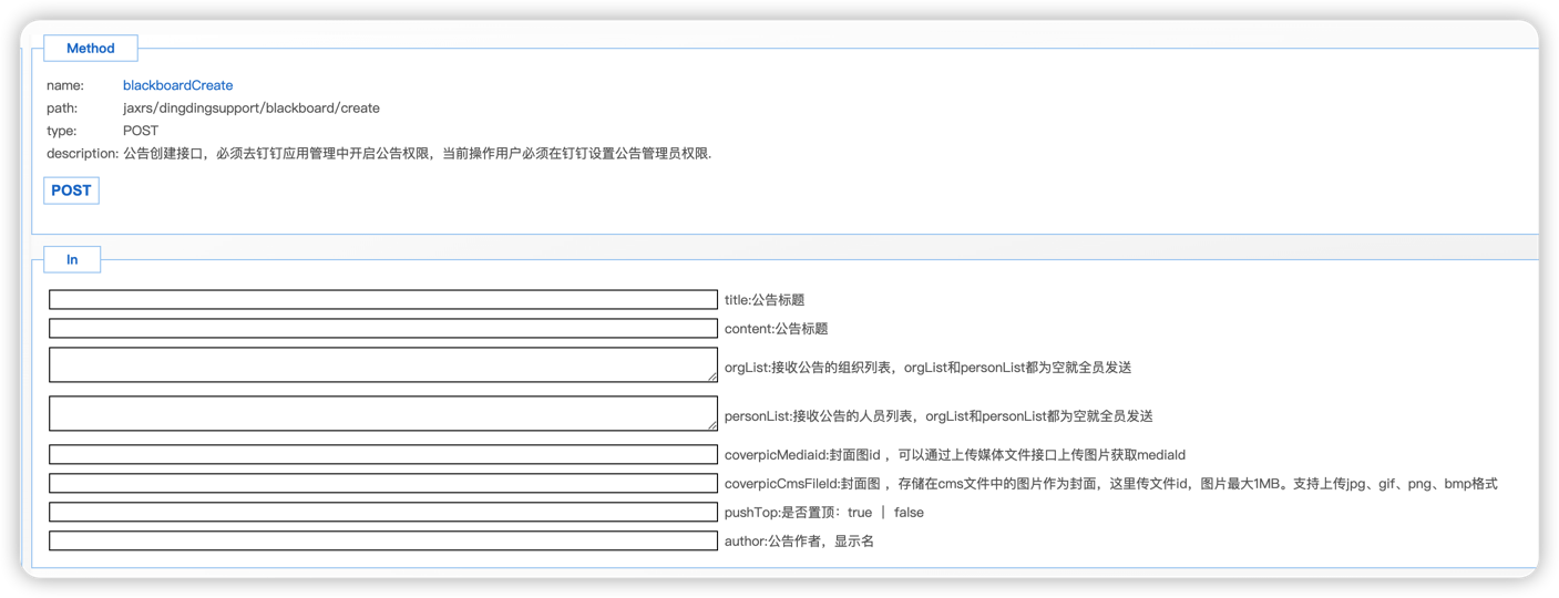 url: /x_app_dingding_support_assemble_control/jaxrs/dingdingsupport/blackboard/create method: post 具体参数说明如下图: