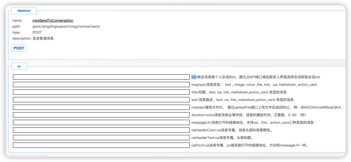 url: /x_app_dingding_support_assemble_control/jaxrs/dingdingsupport/msg/normal/send method: post 各种消息类型需要提交的字段不同,参考文档下面的 消息类型提交内容样例 的样例说明