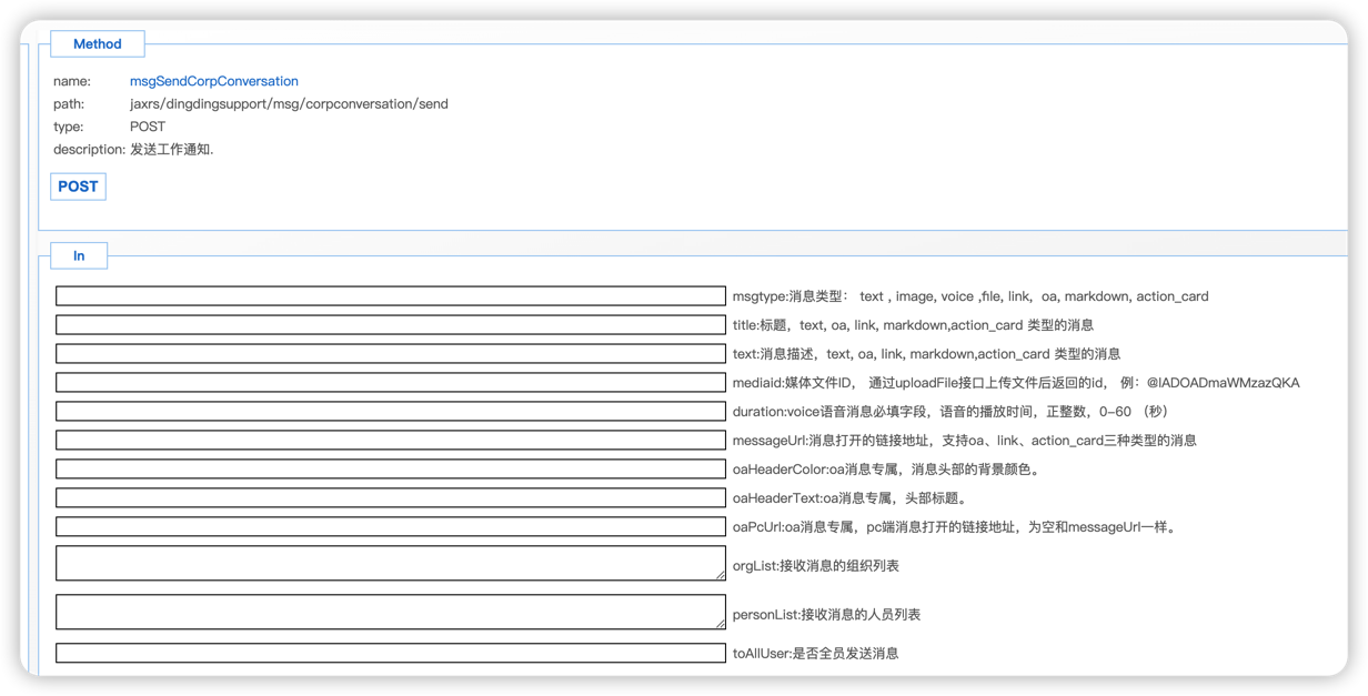 url: /x_app_dingding_support_assemble_control/jaxrs/dingdingsupport/msg/corpconversation/send method: post 各种消息类型需要提交的字段不同,参考文档下面的 消息类型提交内容样例 的样例说明