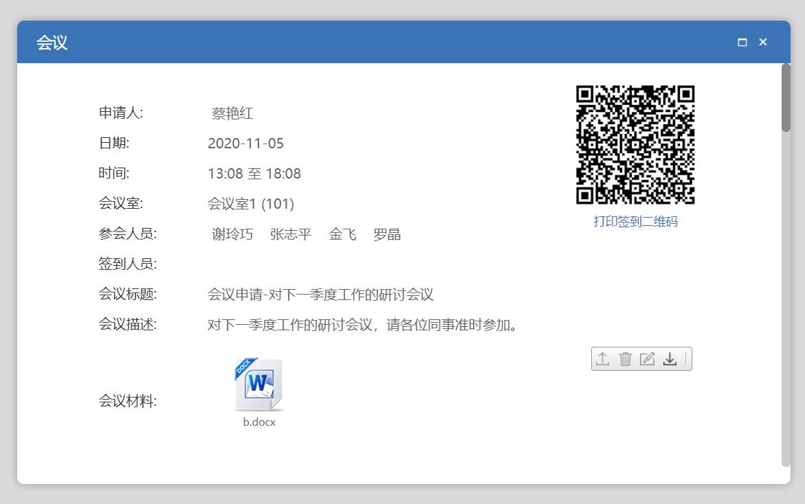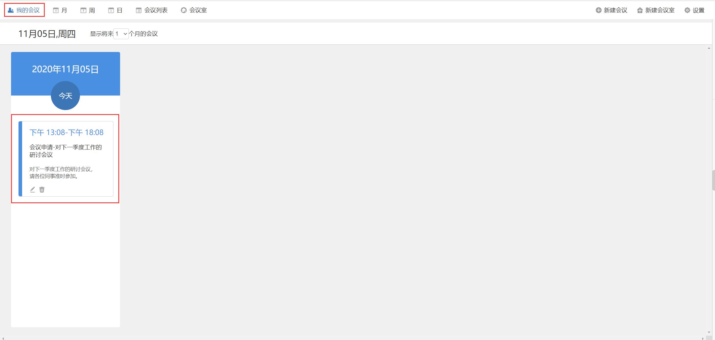 流程流转结束后会自动在本系统自带的会议管理应用中生成对应的会议信息。