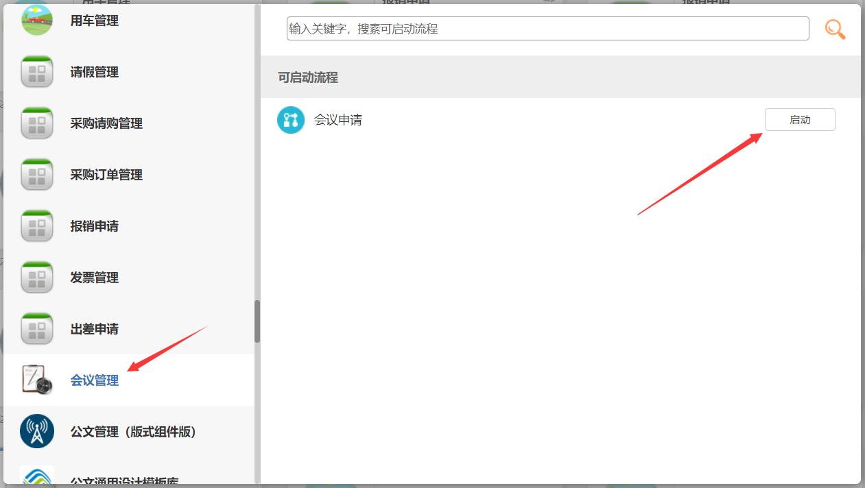 安装后本系统注册用户登录,在办公中心或者系统金太阳下载首页待办区域发起流程。点击会议管理应用,启动会议申请流程。输入内容即可流转。