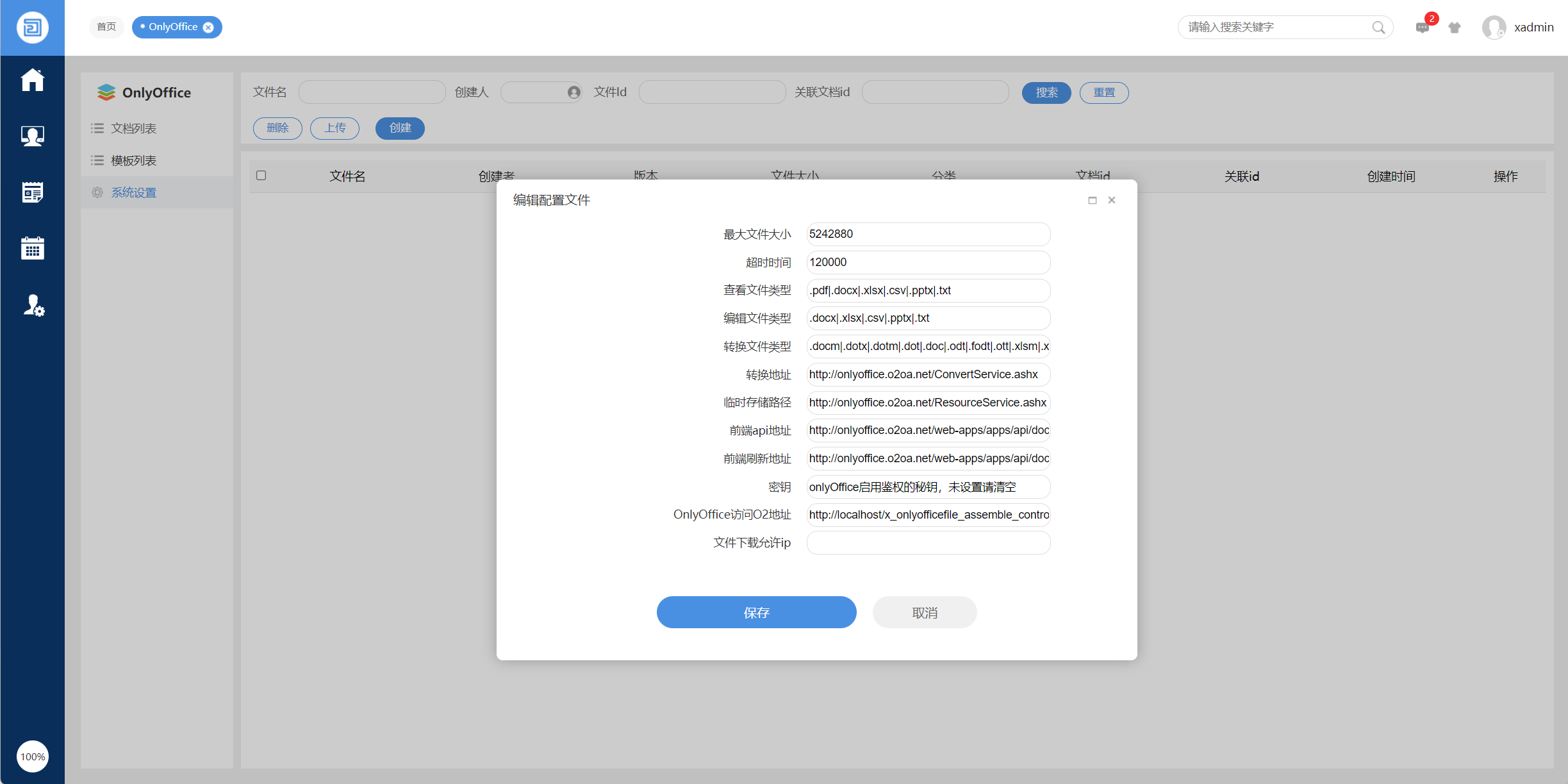 服务器重启完成后,再使用上一步提供的onlyoffice应用链接进入应用,完成系统设置后保存,系统即可正常使用。