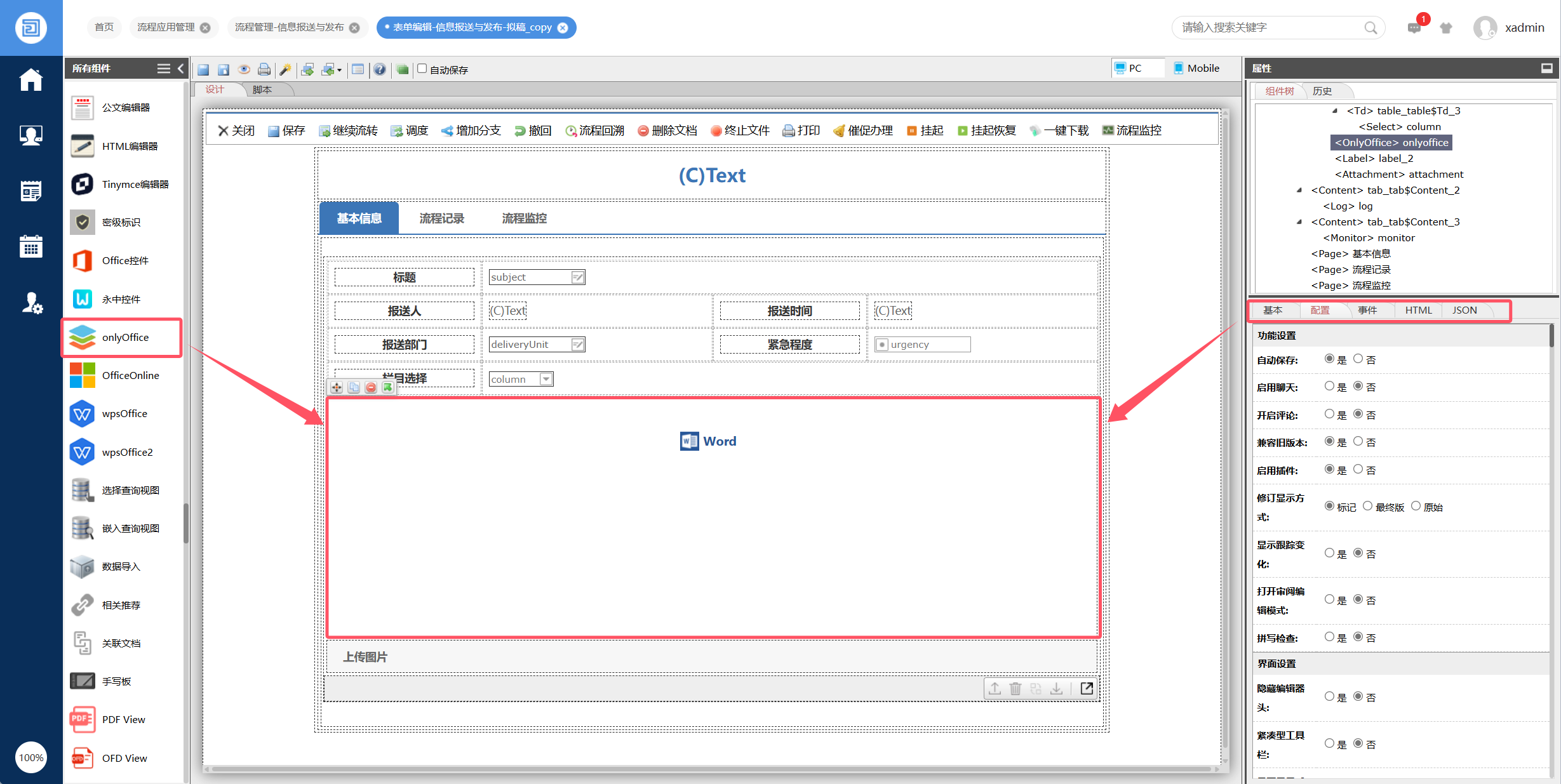 以下是如何在流程中使用onlyoffice组件的部分截图: