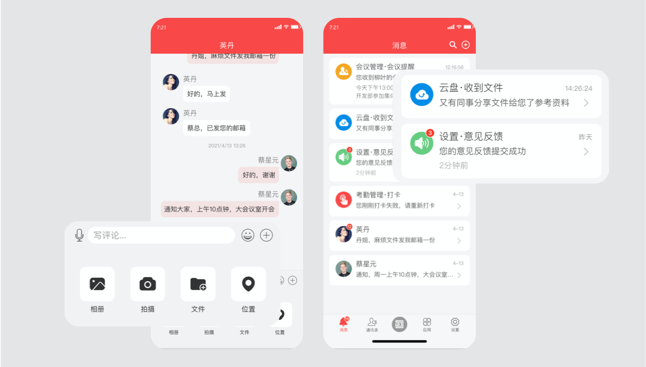 移动app能够为员工之间的沟通提供畅通无阻的交流方式,用户使用单聊、群聊来实现工作中的实时的沟通需求。当待办信息到达时,app以消息通知的形式告诉使用者及时处理。